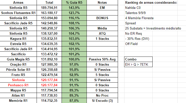 A escolha de armas para Nahida costuma ser bem direta ao ponto, armas com substatus ofensivos para o dano pessoal ou Proficiência para aumentar o buff.